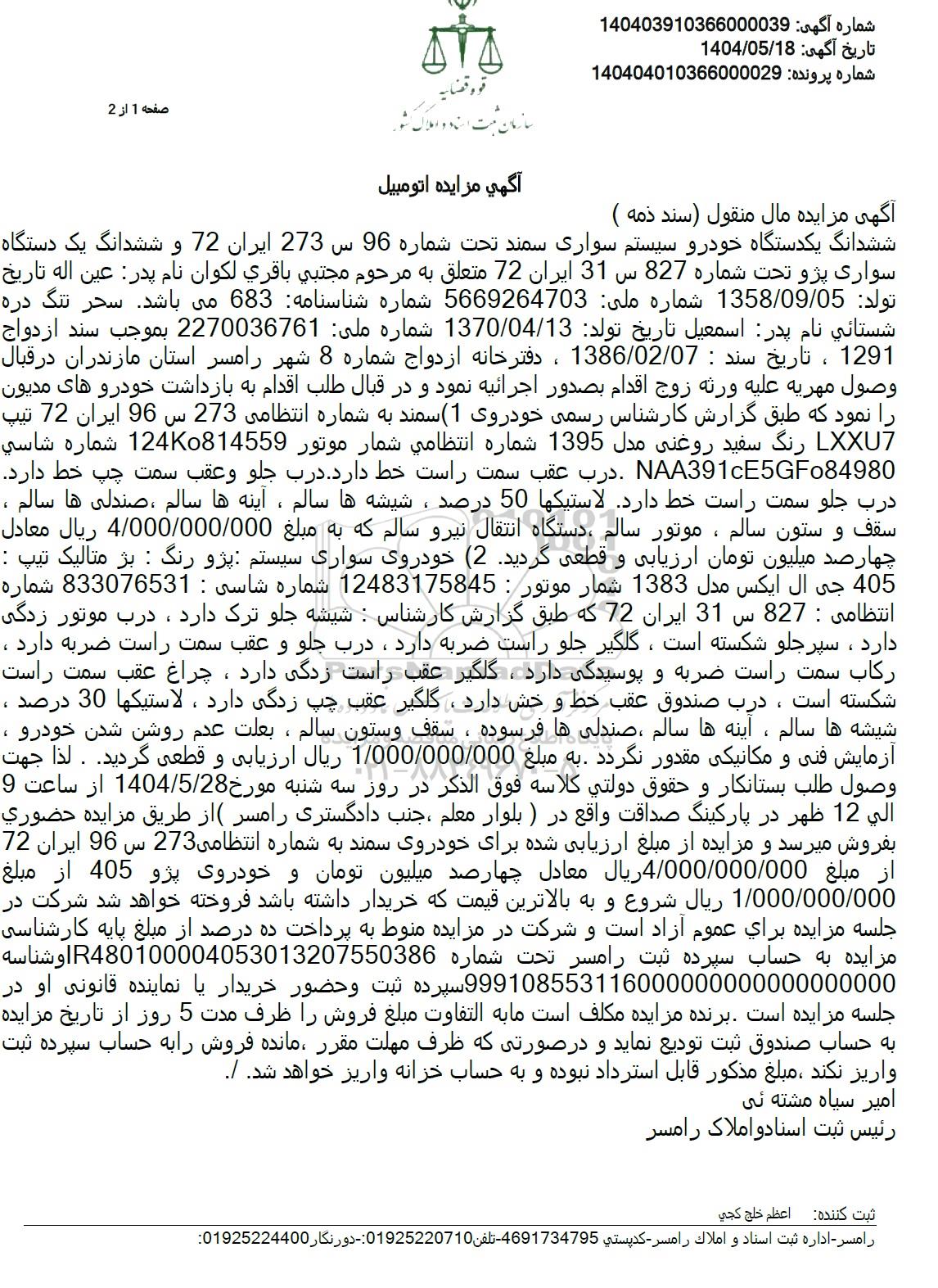 مزایده عمومی مزایده فروش یک دستگاه خودرو سمند LXXU7 برگزار میگردد. از کلیه افراد متخصص و شرکتهای واجد شرایط دعوت به عمل میآید تا در این مزایده با کد خبرگزاری پارس نماد : 9383282 شرکت نمایند تاریخ شروع مزایده : 1404/05/18 مهلت شرکت در مزایده: تا پایان روز 1404/05/28 مکان برگزاری اموال واگذاری استانهای مازندران و دستهبندیهای مربوط به این حراجی انواع خودرو سبک میباشد.