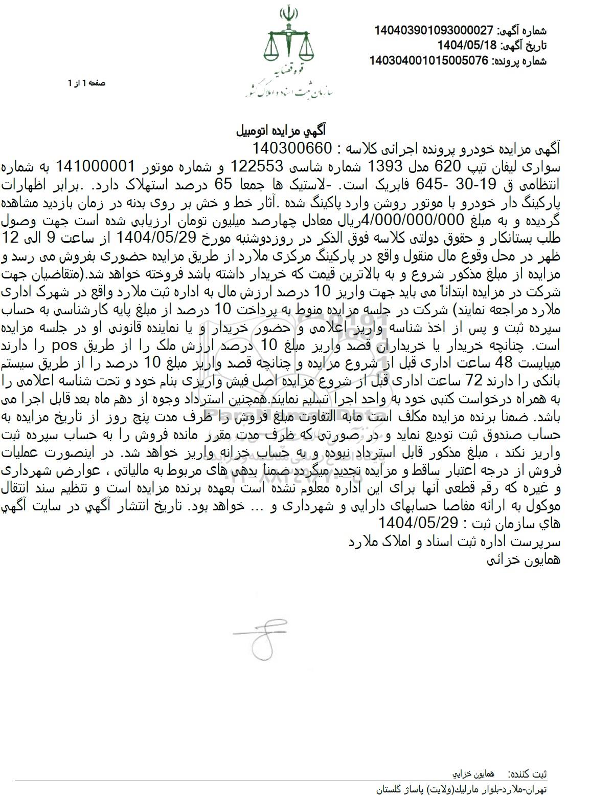 موضوع مزایده:مزایده فروش یک دستگاه لیفان تیپ 620 مدل 1393