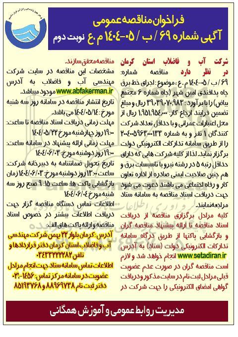 شرکت آب و فاضلاب استان کرمان در نظر دارد شماره مناقصه 69 .ب .05-1404 م . ع ، موضوع : اجرای خط برق چاه پدافندی امین شهر چاه شماره 6 مجتمع بیاض) را با برآورد : 39.039.070.983 ریال و مبلغ تضمین فرایند ارجاع کار: 1.951.954.000 ریال از محل اعتبارات عمرانی و با حداقل تعداد شرکت کنندگان 1 نفر و به شماره 2004005963000133 را از طریق سامانه تدارکات الکترونیکی دولت برگزار نماید. لذا از کلیه شرکت هایی که دارای حداقل رتبه 5 در رشته نیرو یا تاسیسات برق و هم چنین صلاحیت ایمنی صادره از اداره تعاون کار و رفاه اجتماعی می باشند دعوت می شود جهت دریافت اسناد مناقصه به سامانه ستاد مراجعه نمایند.