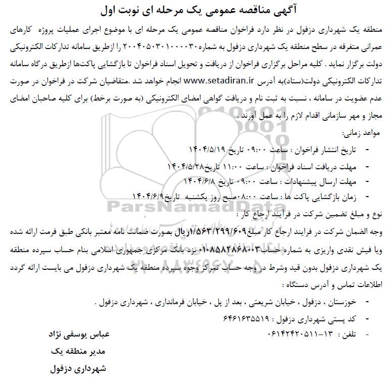منطقه یک شهرداری دزفول در نظر دارد فراخوان مناقصه عمومی یک مرحله ای با موضوع اجرای عملیات پروژه کارهای عمرانی متفرقه در سطح منطقه یک شهرداری دزفول به شماره 2004050301000030 را از طریق سامانه تدارکات الکترونیکی دولت برگزار نماید. کلیه مراحل برگزاری فراخوان از دریافت و تحویل اسناد فراخوان تا بازگشایی پاکت ها از طریق درگاه سامانه تدارکات الکترونیکی دولت (ستاد) به آدرس ستاد ایران انجام خواهد شد. متقاضیان شرکت در فراخوان در صورت عدم عضویت در سامانه ، نسبت به ثبت نام و دریافت گواهی امضای الکترونیکی به صورت برخط برای کلیه صاحبان امضای مجاز و مهر سازمانی اقدام لازم را به عمل آورند .