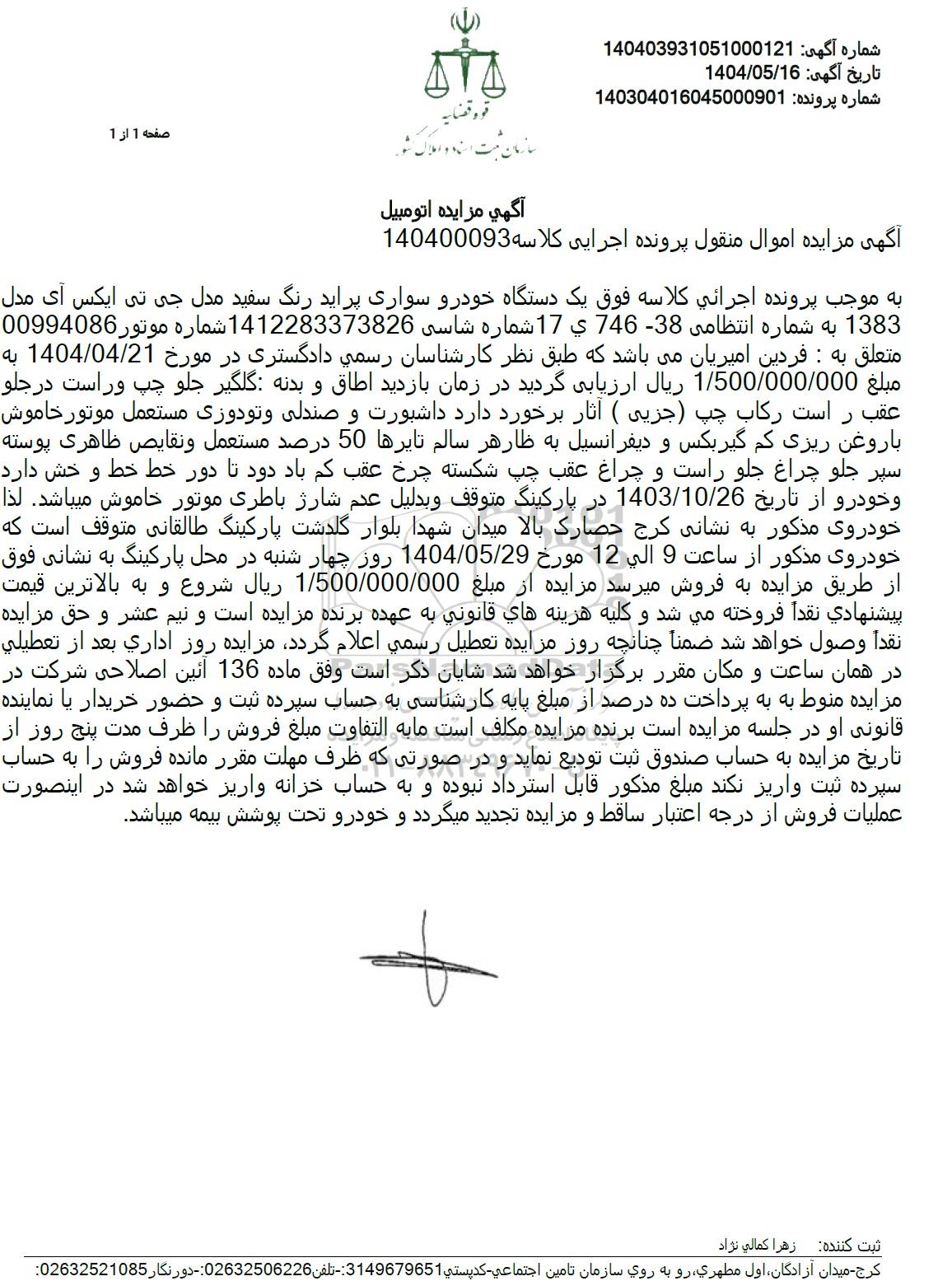 موضوع مزایده: یک دستگاه خودرو سواری پراید رنگ سفید مدل جی تی ایکس آی مدل 1383 به مبلغ 1.500.000.000 ریال
