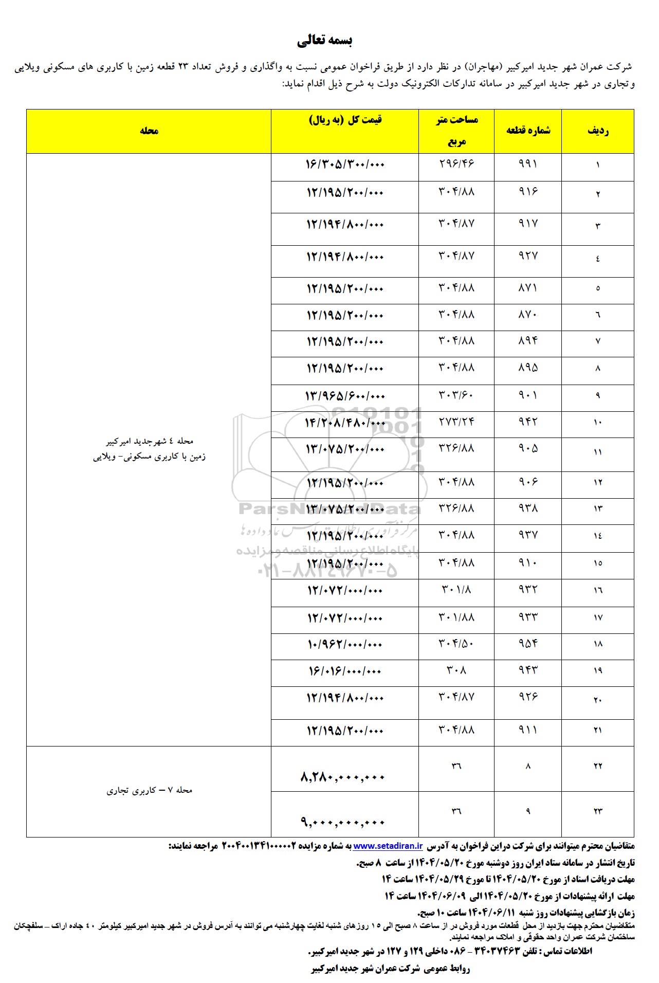 شرکت عمران شهر جدید امیر کبیر (مهاجران) در نظر دارد از طریق فراخوان عمومی نسبت به واگذاری و فروش تعداد 23 قطعه زمین با کاربری های مسکونی ویلایی و تجاری در شهر جدید امیر کبیر سامانه تدارکات الکترونیک دولت به شرح ذیل اقدام نماید