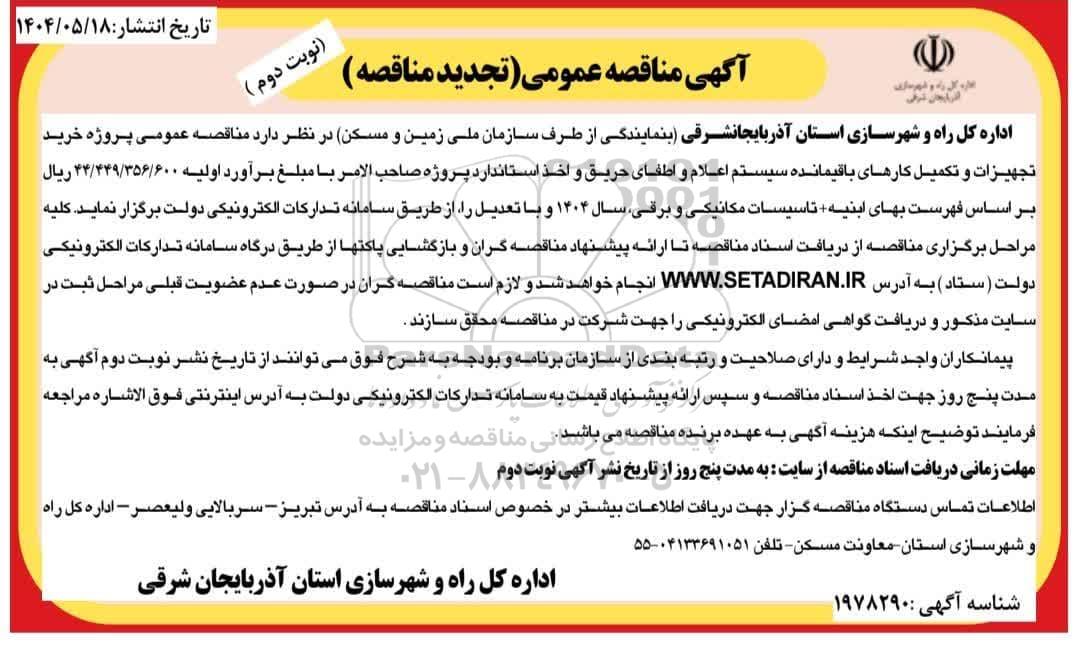 اداره کل راه و شهرسازی استان آذربایجان شرقی (بنمایندگی از طرف سازمان ملی زمین و مسکن) در نظر دارد مناقصه عمومی پروژه خرید تجهیزات و تکمیل کارهای باقیمانده سیستم اعلام و اطفای حریق و اخذ استاندارد پروژه صاحب الامر با مبلغ برآورد اولیه 44.449.356.600 ریال بر اساس فهرست بهای ابنیه + تاسیسات مکانیکی و برقی، سال 1404 و با تعدیل را، از طریق سامانه تدارکات الکترونیکی دولت برگزار نماید. کلیه مراحل برگزاری مناقصه از دریافت اسناد مناقصه تا ارائه پیشنهاد مناقصه گران و بازگشایی پاکتها از طریق درگاه سامانه تدارکات الکترونیکی دولت (ستاد) به آدرس ستاد ایران انجام خواهد شد و لازم است مناقصه گران در صورت عدم عضویت قبلی مراحل ثبت در سایت مذکور و دریافت گواهی امضای الکترونیکی را جهت شرکت در مناقصه محقق سازند .