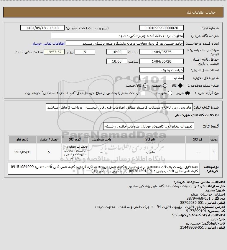 شرح کلی نیاز: مادربرد ، رم ، CPU و متعلقات کامپیوتر مطابق اطلاعات فنی فایل پیوست _ پرداخت 3 ماهه میباشد