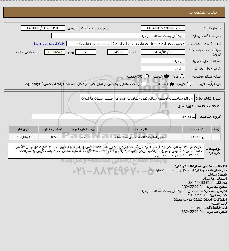 شرح کلی نیاز: اجرای ساختمان توسعه سالن تجزیه مبادلات اداره کل پُست استان مازندران