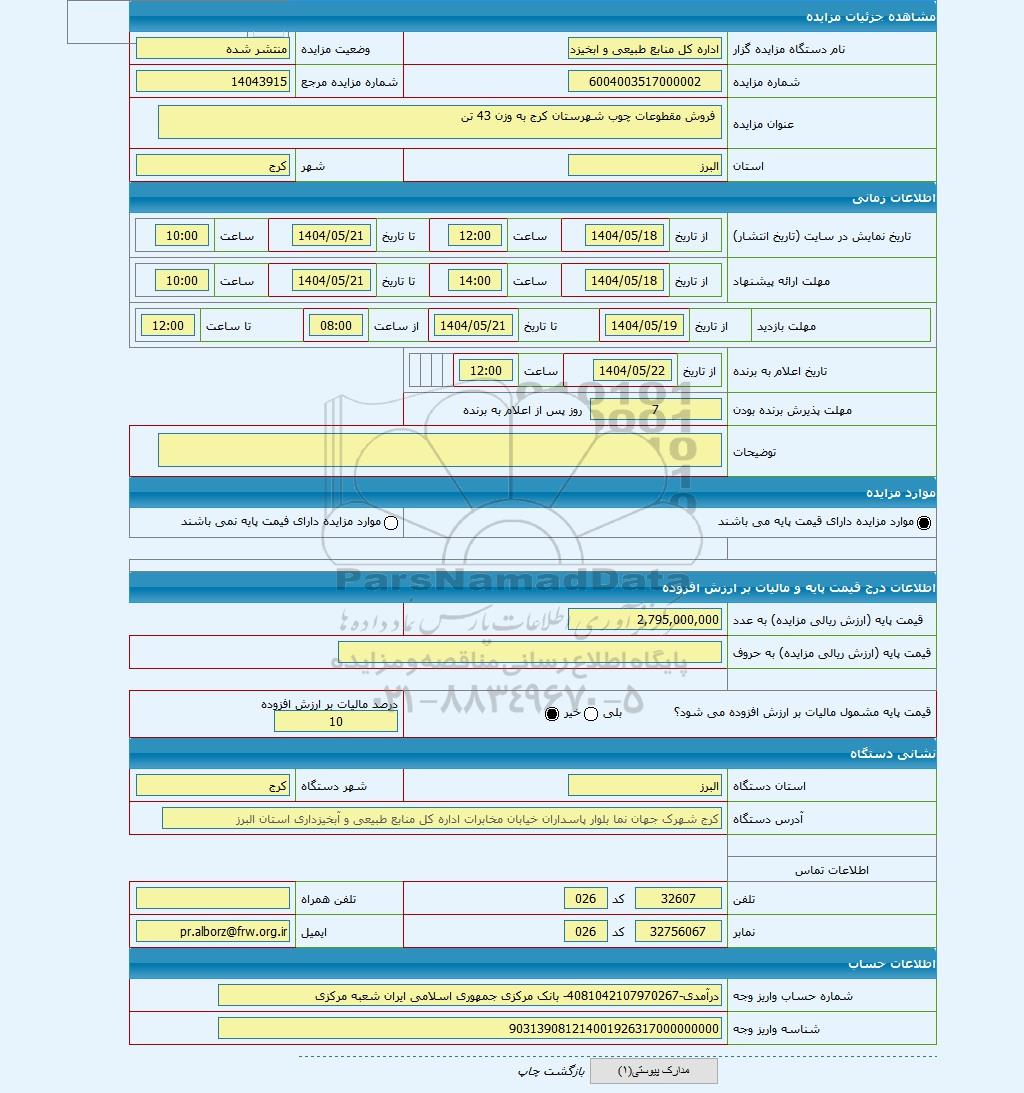 عنوان مزایده | فروش مقطوعات چوب شهرستان کرج به وزن 43 تن | |||