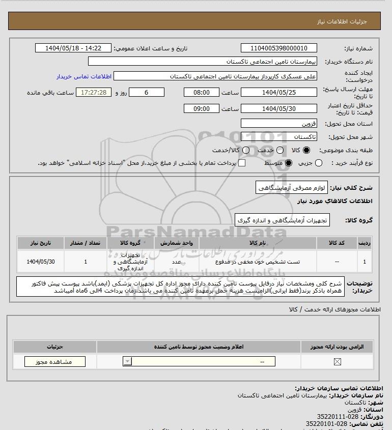 نام دستگاه خریدار:بیمارستان تامین اجتماعی تاکستان