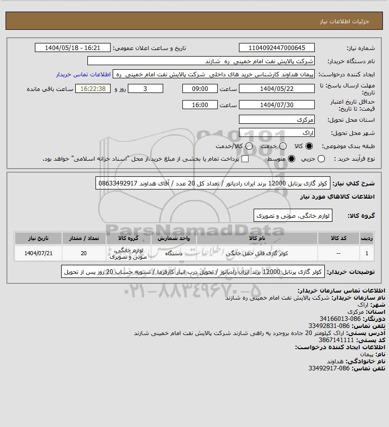 شرح کلی نیاز: کولر گازی پرتابل 12000 برند ایران رادیاتور / تعداد کل 20 عدد / آقای هداوند 08633492917