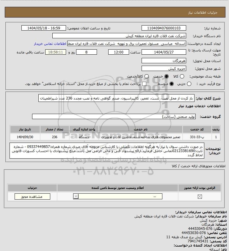 شرح کلی نیاز: باز کردن از محل نصب، تست، تعمیر، کالیبراسیون، صدور گواهی نامه و نصب مجدد 236 عدد شیراطمینان