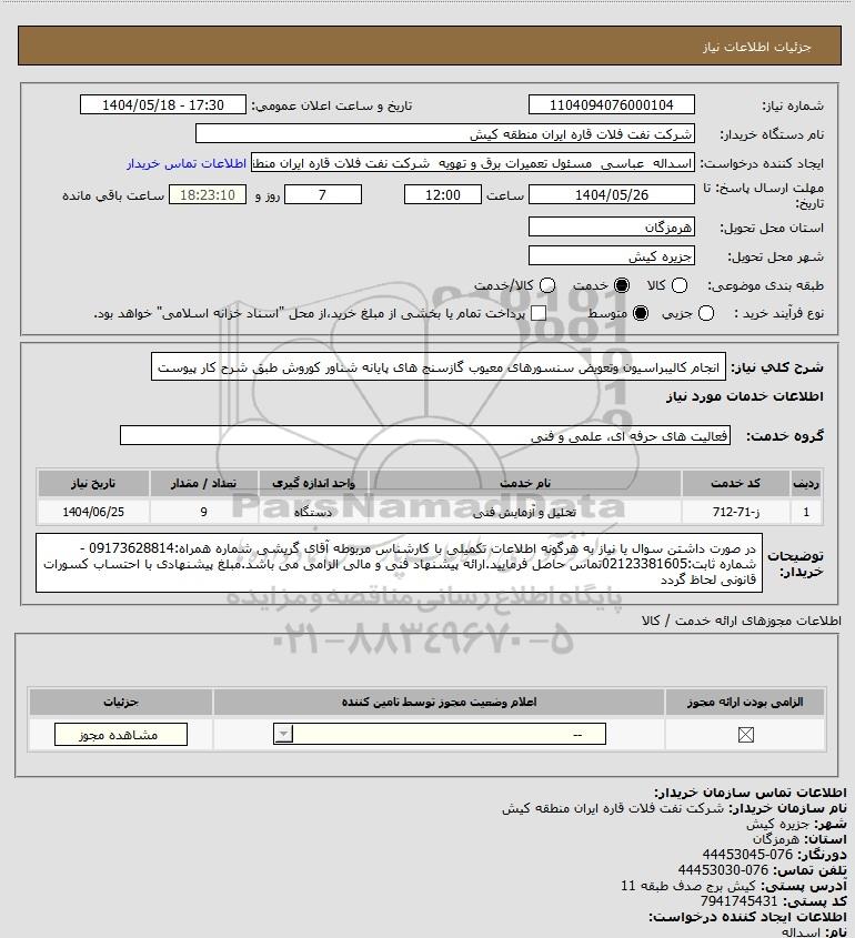 شرح کلی نیاز: انجام کالیبراسیون وتعویض سنسورهای معیوب گازسنج های پایانه شناور کوروش طبق شرح کار پیوست