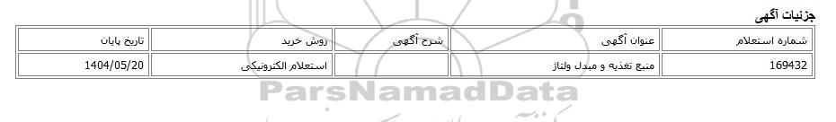 | 169432 | منبع تغذیه و مبدل ولتاژ | استعلام الکترونیکی | 1404/05/20 |