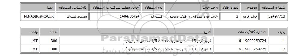 52497713قرنیز قرمز2خرید مواد مصرفی و اقلام عمومیکشوری1404/05/24محمود نصیریM.NASIRI@KSC.IR
