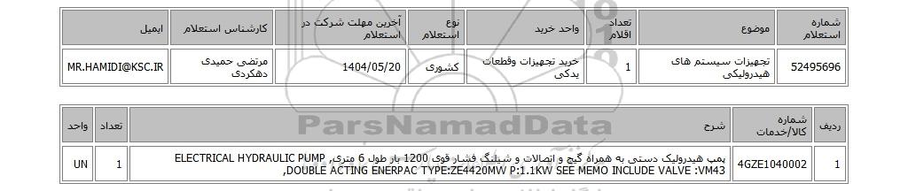 استعلام تجهیزات سیستم های هیدرولیکی, استعلام تجهیزات سیستم های هیدرولیکی