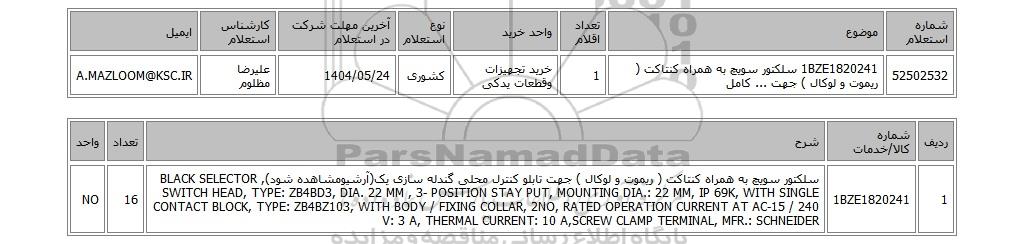 | 52502532 | 1BZE1820241 سلکتور سویچ به همراه کنتاکت ( ریموت و لوکال ) جهت ... کامل | 1 | خرید تجهیزات وقطعات یدکی | کشوری | 1404/05/24 | علیرضا مظلوم | A.MAZLOOM@KSC.IR |