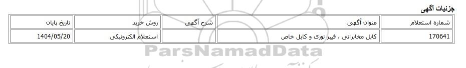 | 170641 | کابل مخابراتی ، فیبر نوری و کابل خاص | استعلام الکترونیکی | 1404/05/20 |