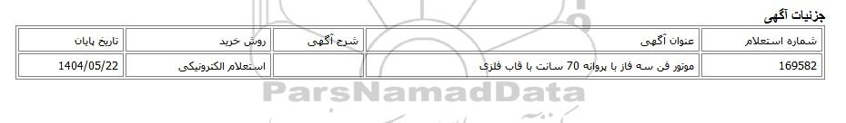 | 169582 | موتور فن سه فاز با پروانه 70 سانت با قاب فلزی | استعلام الکترونیکی | 1404/05/22 |
