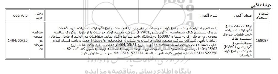 | 168087 | ارائه خدمات جامع نگهداری، تعمیرات، خرید قطعات ضروری سیستم های سرمایشی و گرمایشی (HVAC) شرکت مجتمع فولاد خراسان | با سلام و احترام شرکت مجتمع فولاد خراسان در نظر دارد ارائه خدمات جامع نگهداری، تعمیرات، خرید قطعات ضروری سیستم های سرمایشی و گرمایشی (HVAC) شرکت مجتمع فولاد خراسان را از طریق برگزاری مناقصه عمومی دو مرحله ای به شماره 168087 به پیمانکار واجد شرایط واگذار نماید. متقاضیان می توانند از طریق سامانه ارتباط با تأمین کنندگان شرکت مجتمع فولاد خراسان به نشانی- https-//srm.kscco.ir جهت دریافت اسناد اقدام نماید. ضمناً مهلت دریافت اسناد مناقصه مذکور تا تاریخ 1404/05/31و مهلت تسلیم پاکت ها تا تاریخ 1404/05/03خواهد بود. شماره تماس جهت طرح سوالات مرتبط به سامانه ارتباط با تأمین کنندگان- 62 - 05141522258 شماره تماس کارشناس مناقصه- 05141522274 آقای مهندس ملکوتی فر ; | مناقصه عمومی دو مرحله ای | 1404/05/25 |