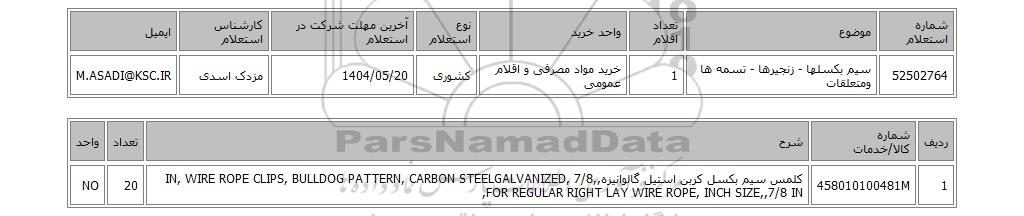 52502764سیم بکسلها - زنجیرها - تسمه ها ومتعلقات1خرید مواد مصرفی و اقلام عمومیکشوری1404/05/20مزدک اسدیM.ASADI@KSC.IR