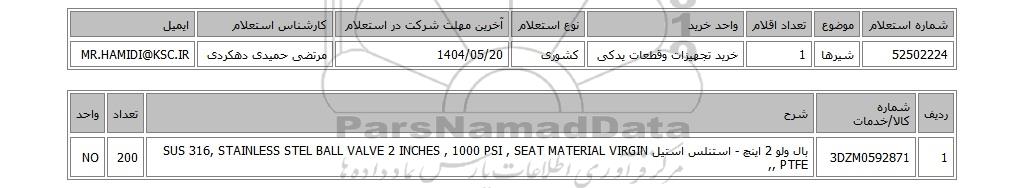 52502224شیرها1خرید تجهیزات وقطعات یدکیکشوری1404/05/20مرتضی حمیدی دهکردیMR.HAMIDI@KSC.IR