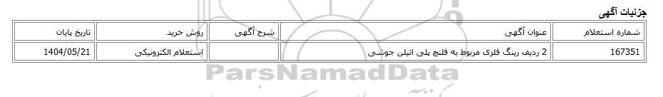 | 167351 | 2 ردیف رینگ فلزی مربوط به فلنچ پلی اتیلن جوشی | استعلام الکترونیکی | 1404/05/21 |