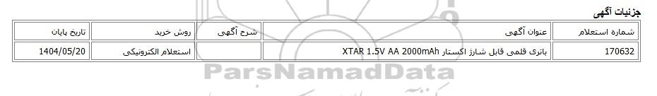 | 170632 | باتری قلمی قابل شارژ اکستار XTAR 1.5V AA 2000mAh | استعلام الکترونیکی | 1404/05/20 |