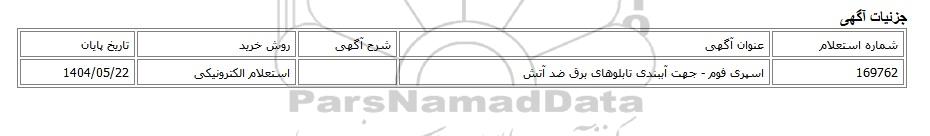 | 169762 | اسپری فوم - جهت آببندی تابلوهای برق ضد آتش | استعلام الکترونیکی | 1404/05/22 |