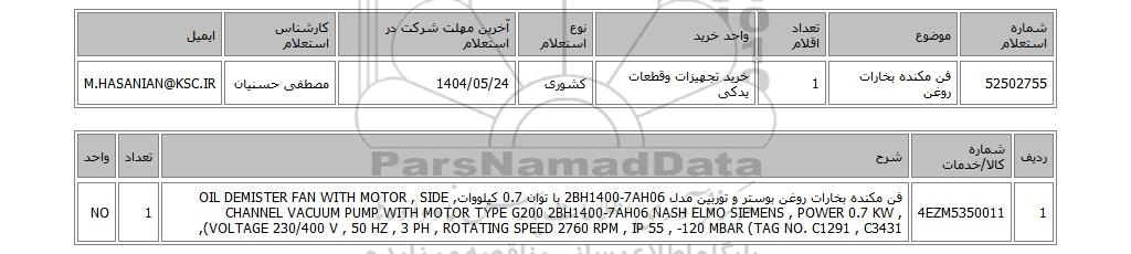 | 52502755 | فن مکنده بخارات روغن | 1 | خرید تجهیزات وقطعات یدکی | کشوری | 1404/05/24 | مصطفی حسنیان | M.HASANIAN@KSC.IR |