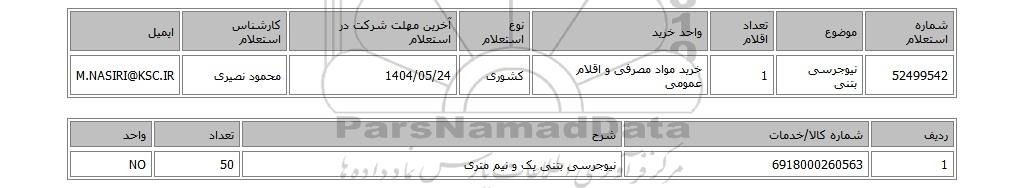 | 52499542 | نیوجرسی بتنی | 1 | خرید مواد مصرفی و اقلام عمومی | کشوری | 1404/05/24 | محمود نصیری | M.NASIRI@KSC.IR |