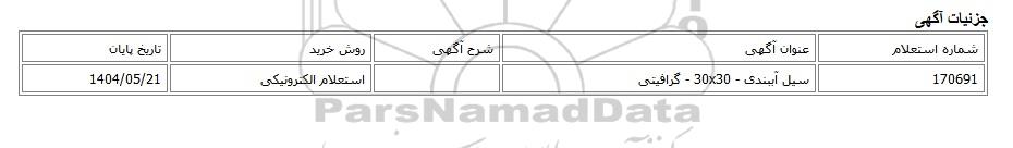| 170691 | سیل آببندی - 30x30 - گرافیتی | استعلام الکترونیکی | 1404/05/21 |