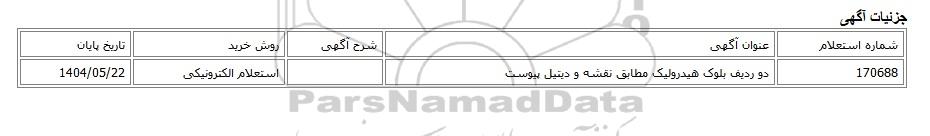 | 170688 | دو ردیف بلوک هیدرولیک مطابق نقشه و دیتیل پیوست | استعلام الکترونیکی | 1404/05/22 |
