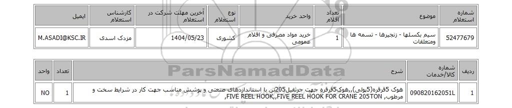 | 1 | 090820162051L | هوک 5قرقره(5پولی),,هوک5قرقره جهت جرثقیل205تن با استانداردهای صنعتی و پوشش مناسب جهت کار در شرایط سخت و مرطوب, FIVE REEL HOOK,,FIVE REEL HOOK FOR CRANE 205TON, | 1 | NO |