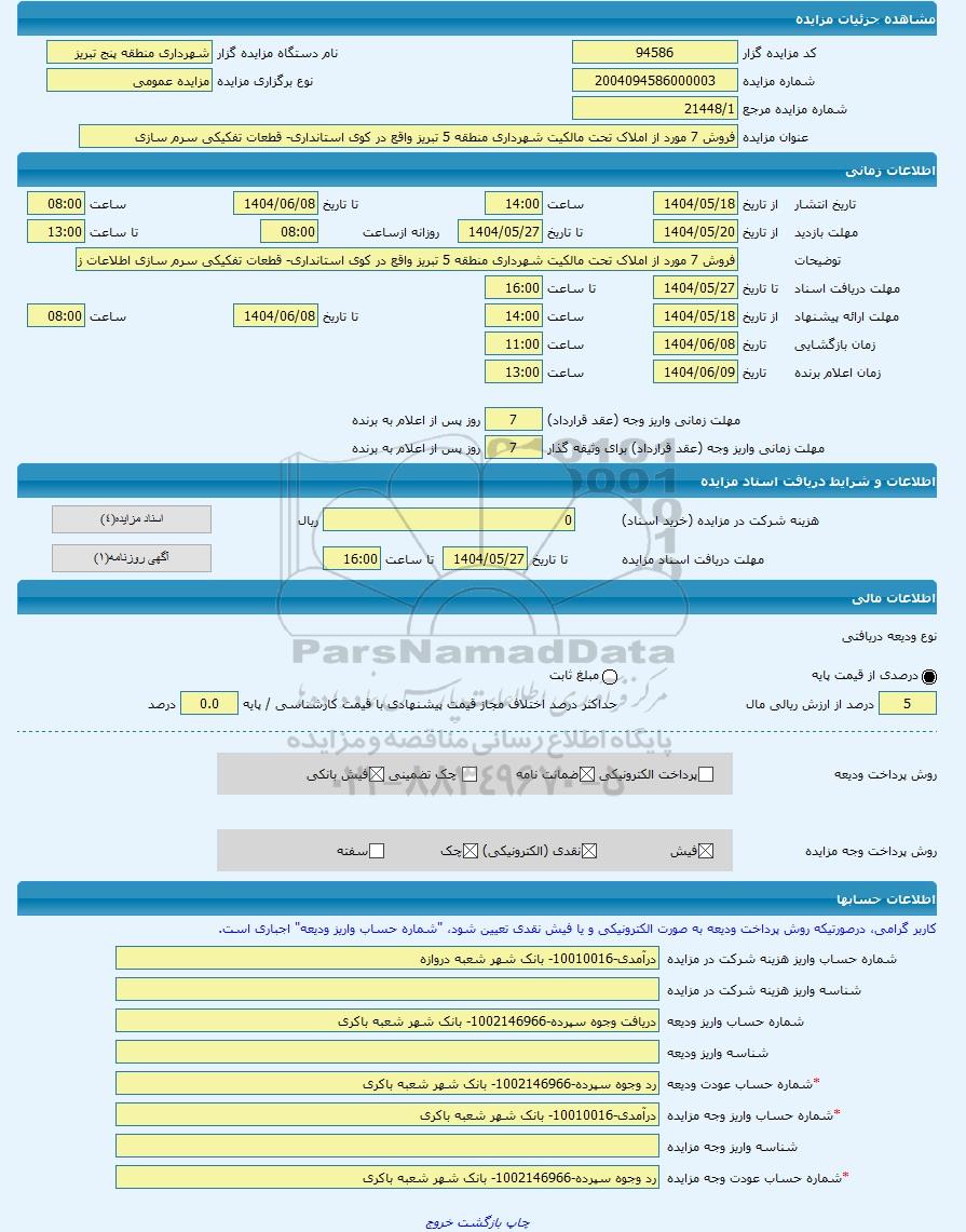 | عنوان مزایده | فروش 7 مورد از املاک تحت مالکیت شهرداری منطقه 5 تبریز واقع در کوی استانداری- قطعات تفکیکی سرم سازی -مزایده زمین - استان آذربایجان شرقی | |||