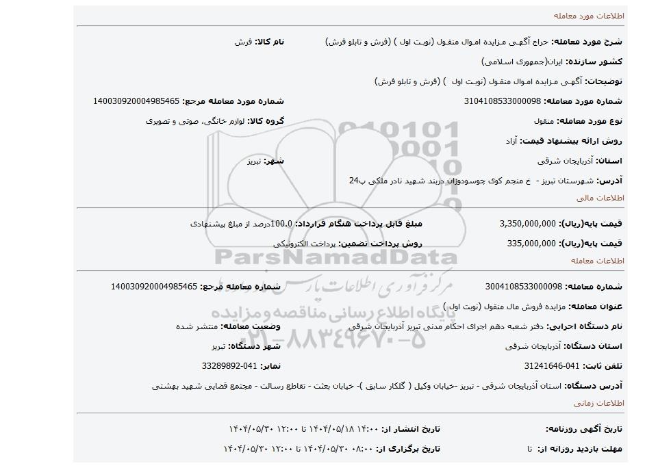 | نام دستگاه اجرایی: دفتر شعبه دهم اجرای احکام مدنی تبریز آذربایجان شرقی | وضعیت معامله: منتشر شده | |