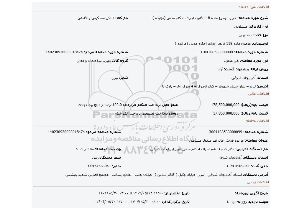 9 مزایده دستور فروش ملک مشاعی 9810687 1404/08/15 new not special not payed آذربایجان شرقی