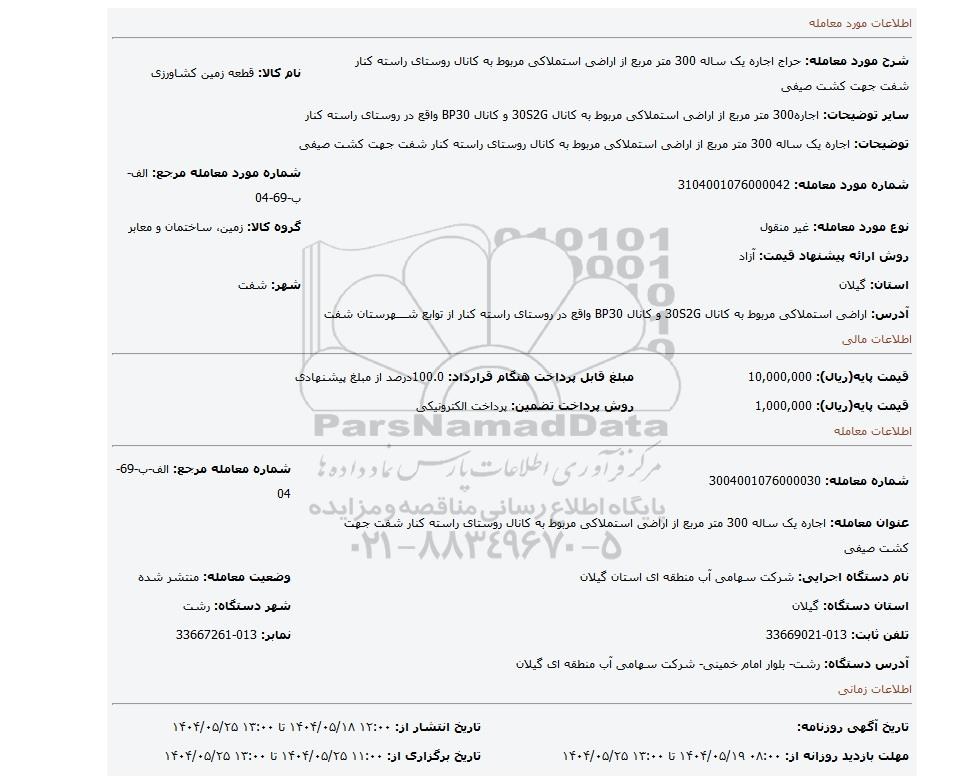 مزایده عمومی مزایده اجاره یک ساله 300 متر مربع از اراضی استملاکی مربوط به کانال روستای راسته کنار شفت جهت کشت صیفی برگزار میگردد. از کلیه افراد متخصص و شرکت‌های واجد شرایط دعوت به عمل می‌آید تا در این مزایده با کد خبرگزاری پارس نماد : 9385092 شرکت نمایند تاریخ شروع مزایده : 1404/05/18 مهلت شرکت در مزایده: تا پایان روز 1404/05/25 مکان برگزاری اموال واگذاری استان‌های گیلان و دسته‌بندی‌های مربوط به این حراجی ماشین آلات و تجهیزات کشاورزی و دام پروری, املاک و زمین میباشد.