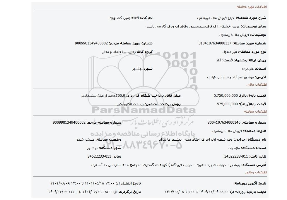 | شرح مورد معامله: حراج فروش مال غیرمنقول | نام کالا: قطعه زمین کشاورزی | |