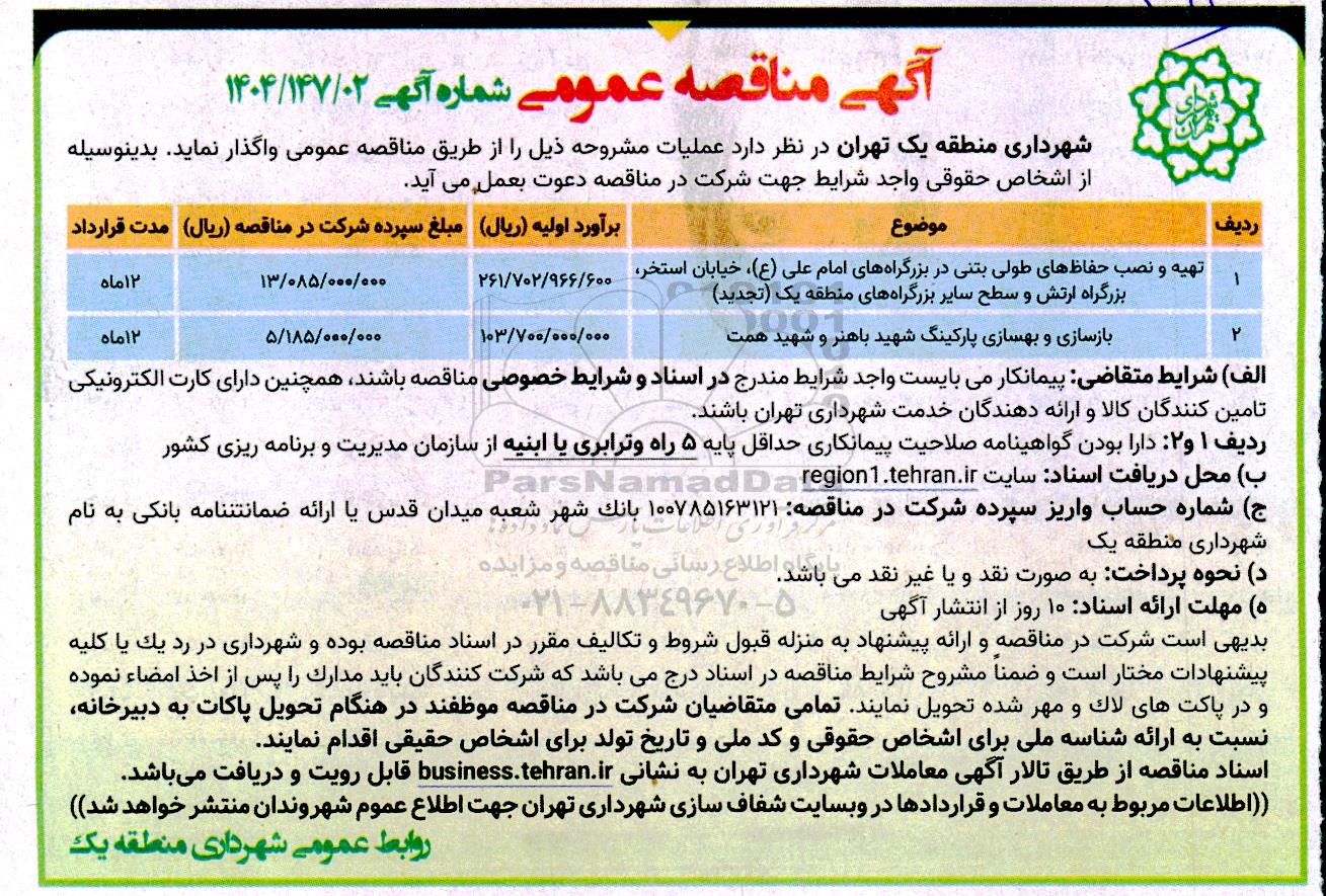 شهرداری منطقه یک تهران در نظر دارد عملیات مشروحه ذیل را از طریق مناقصه عمومی واگذار نماید. بدینوسیله از اشخاص حقوقی واجد شرایط جهت شرکت در مناقصه دعوت به عمل می آید.