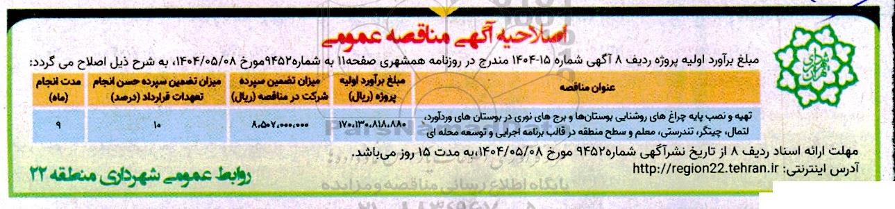 مبلغ برآورد اولیه پروژه ردیف 8 آگهی شماره 15-1404 مندرج در روزنامه همشهری صفحه 11 به شماره 9452 مورخ 1404.5.8 به شرح ذیل اصلاح می گردد: