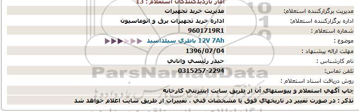 استعلام بها و موضوع استعلام استعلام,استعلام باطری سیلد اسید به اطلاع کلیه شرکتها و افراد متخصص واجد شرایط میرساند، آگهی گذار در نظر دارد از طریق استعلام بها، نسبت به انتخاب و دریافت پیشنهادات اقدام نماید. این استعلام با کد آگهی ثبت شده در سامانه خبرگزاری پارس نماد : 938552 منتشر شده است. مشخصات استعلام : تاریخ شروع استعلام: 1396/06/29 آخرین مهلت ارسال پیشنهاد قیمت : 1396/07/04 و محل اجرای پروژه : استان اصفهان میباشد. استعلام قیمت مورد درخواست : استعلام,استعلام باطری سیلد اسید با دستهبندیهای تخصصی و گروه های مرتبط : منابع تغذیه, تجهیزات برق و الکترونیک, استعلام اطلاع رسانی میگردد.