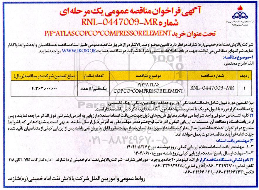 | 1 | RNL- 0447009 -MR | P/F ATLAS COPCO COMPRESSORELEMENT | یک قلم / 5 عدد | 4.363.000.000 |