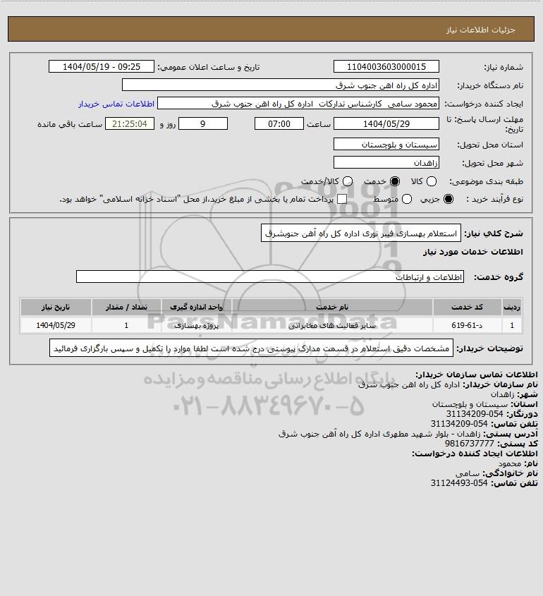 شرح کلی نیاز: استعلام بهسازی فیبر نوری اداره کل راه آهن جنوبشرق