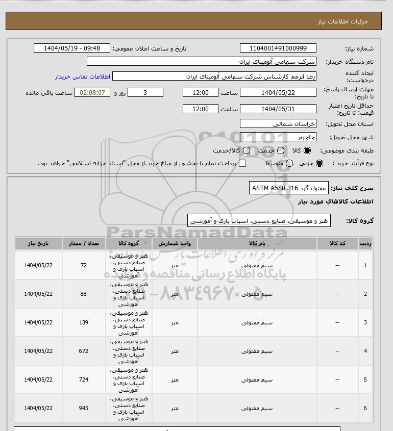 | 2 | -- | سیم مفتولی | متر | هنر و موسیقی، صنایع دستی، اسباب بازی و آموزشی | 88 | 1404/05/22 |