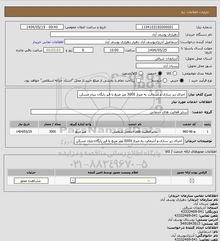 شرح کلی نیاز: اجرای زیر سازی و آسفالت به متراژ 3000 متر مربع با قیر رایگان بنیاد مسکن