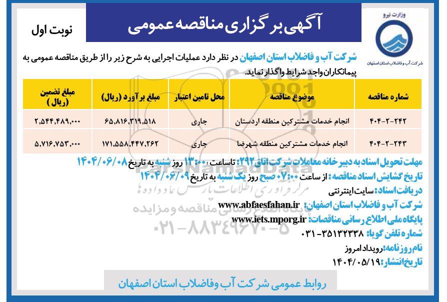 شرکت آب و فاضلاب استان اصفهان در نظر دارد عملیات اجرایی به شرح زیر را از طریق مناقصه عمومی به پیمانکاران واجد شرایط واگذار نماید.