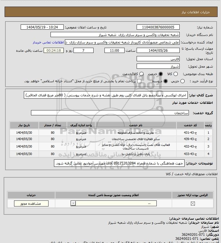 شرح کلی نیاز: اجرای اپوکسی و ساندویچ پانل فضای کلین روم طبق نقشه و شرح خدمات پیوستی. ( 80متر مربع فضای الحاقی)