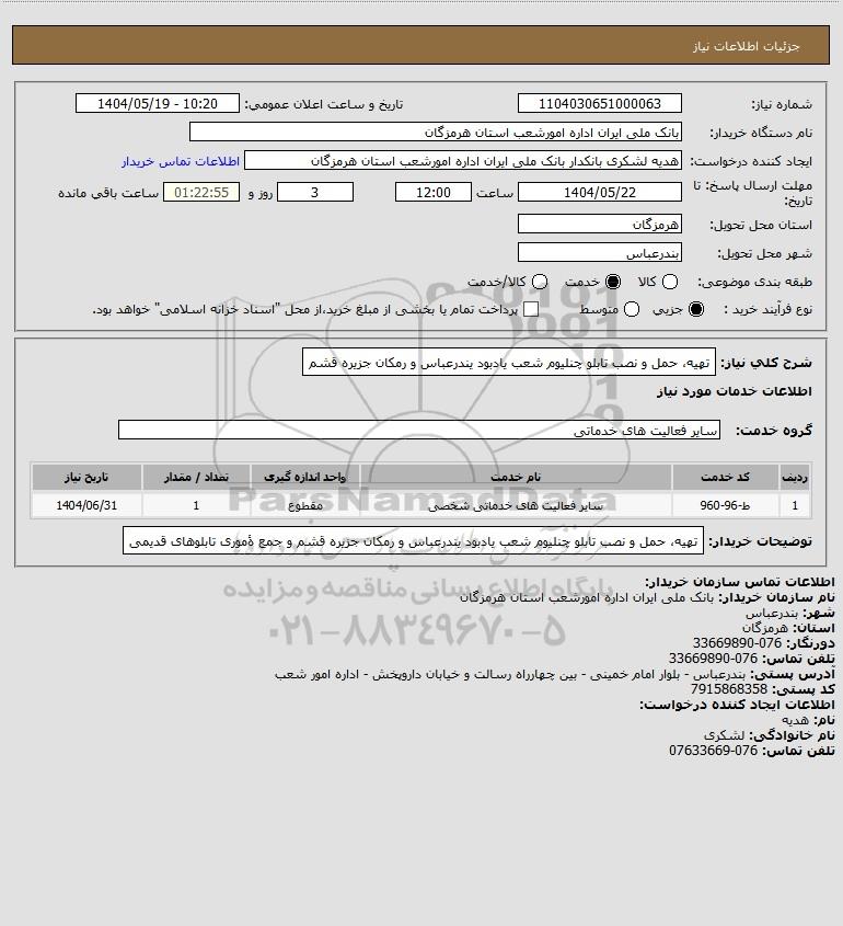 شرح کلی نیاز: تهیه، حمل و نصب تابلو چنلیوم شعب یادبود یندرعباس و رمکان جزیره قشم