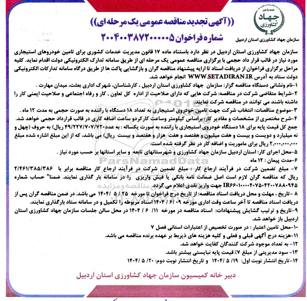 سازمان جهاد کشاورزی استان اردبیل در نظر دارد باستناد ماده 17 قانون مدیریت خدمات کشاورزی برای تامین خودروهای استیجاری مورد نیاز در قالب قرارداد حجمی با برگزاری مناقصه عمومی یک مرحله ای از طریق سامانه تدارک الکترونیکی دولت برگزار نماید. کلیه مراحل برگزاری فراخوان از دریافت اسناد تا ارائه پیشنهاد مناقصه گران و بازگشایی پاکت ها از طریق درگاه سامانه تدارکات الکترونیکی دولت ستاد به آدرس: سایت ستاد ایران انجام خواهد شد