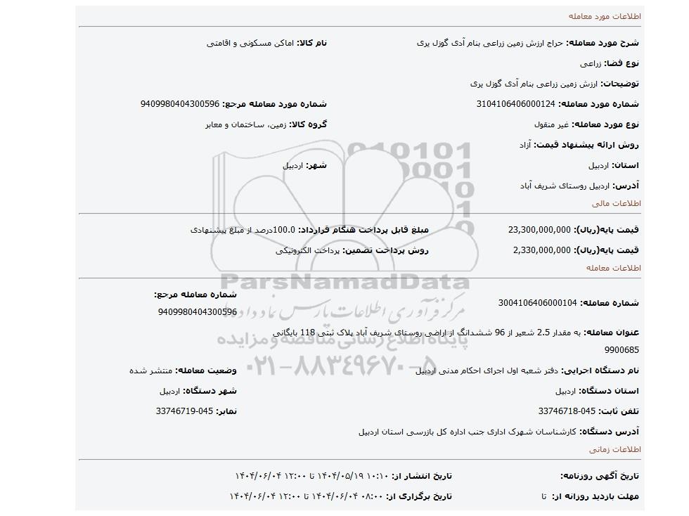 مزایده عمومی مزایده ارزش زمین زراعی بنام آدی گوزل یری برگزار میگردد. از کلیه افراد متخصص و شرکت‌های واجد شرایط دعوت به عمل می‌آید تا در این مزایده با کد خبرگزاری پارس نماد : 9386309 شرکت نمایند تاریخ شروع مزایده : 1404/05/19 مهلت شرکت در مزایده: تا پایان روز 1404/06/04 مکان برگزاری اموال واگذاری استان‌های اردبیل و دسته‌بندی‌های مربوط به این حراجی ماشین آلات و تجهیزات کشاورزی و دام پروری, املاک و زمین میباشد. اطلاعات دقیق‌تر درباره شرایط شرکت در مزایده آنلاین و نحوه ارسال مدارک، الزامات پروژه و دریافت اسناد مزایده و تاریخ بازگشایی پاکت‌ها، در بخش اطلاعات تکمیلی این آگهی درج شده است.