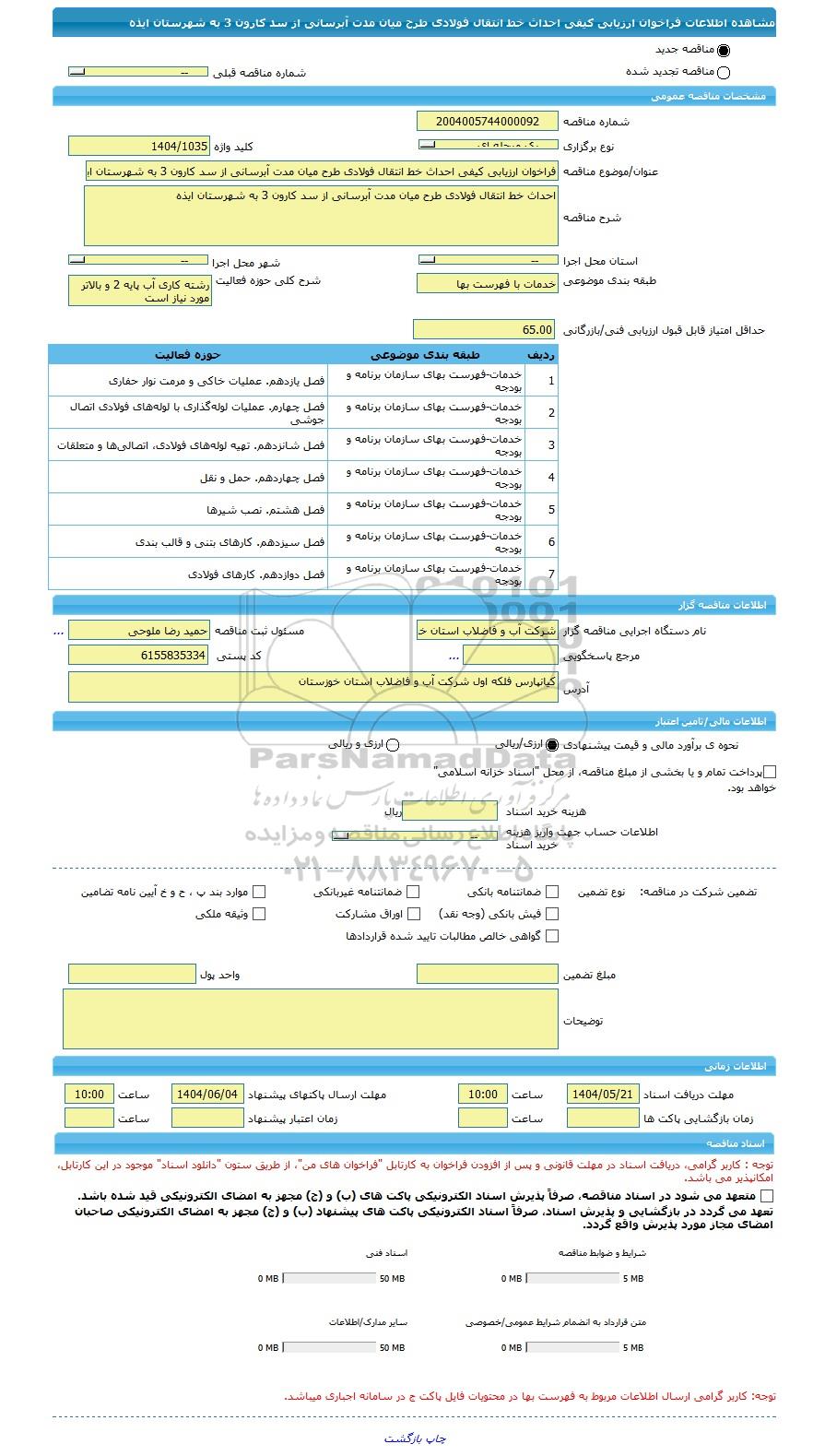 | شرح مناقصه | احداث خط انتقال فولادی طرح میان مدت آبرسانی از سد کارون 3 به شهرستان ایذه | ||||||||||||||||||||||||||