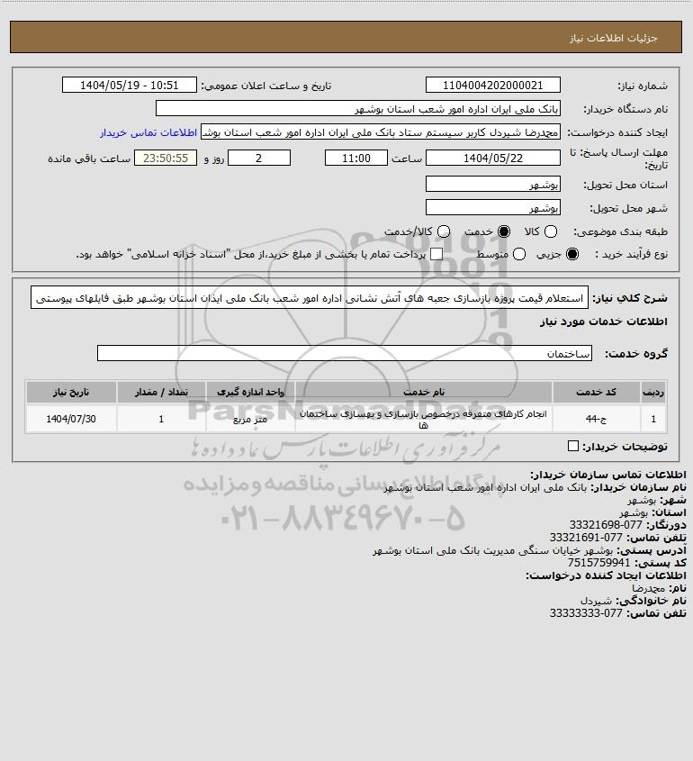 استعلام استعلام قیمت پروژه بازسازی جعبه های آتش نشانی اداره امور شعب بانک ملی ایذان استان بوشهر طبق فایلهای پیوستی, استعلام استعلام قیمت پروژه بازسازی جعبه های آتش نشانی اداره امور شعب بانک ملی ایذان استان بوشهر طبق فایلهای پیوستی